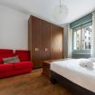 La zona notte è composta da 2 camere da letto, uno studio, 2 bagni ed una lavanderia. Entrambe le camere da letto dispongono di un armadio guardaroba (uno dei due è parzialmente occupato) e di una scrivania completa di seduta. Nella stanza padronale, dove sul parquet di rovere spicca un divano rosso acceso ed un bel baule d’antiquariato, sono presenti 2 letti singoli (80 x 200 cm) unibili su richiesta, così da essere allestiti per formare un letto matrimoniale. Nella camera degli ospiti, che è dotata di un balcone con affaccio sulla corte interna, è presente un comodo letto matrimoniale (160 x 200 cm). La terza stanza è uno studio che ospita un grazioso caminetto ed mobile contenitore realizzato su misura: la stanza è dotata di un letto singolo stile impero (80 x 200 cm) ed ha un pavimento realizzato in resina bicolore.