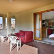 L'appartamento si apre su un soggiorno dove i colori pastello degli arredi fanno contrasto con il legno di ciliegio usato per le finiture. L'immobile si presenta luminoso ed elegante grazie alle ampie vetrate che circondano la sala e la camera da letto affacciandosi verso i primi colli, che spuntano in lontananza sull'orizzonte. Si può accedere al terrazzo - che circonda tutta la proprietà - sia dal soggiorno che dalla zona notte. In particolare, la zona living comprende un tavolo da pranzo per quattro persone, divano letto a 2 piazze ed una cucina moderna e funzionale, dotata di forno. Di fronte al divano si trova il mobile per la TV da 32" a schermo piatto.