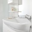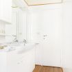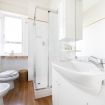 Il bagno è dotato di una grande cabina doccia in cristallo: si tratta di un ambiente confortevole e rilassante, caratterizzato dai tenui toni delle ceramiche decorative.