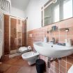 Il bagno en-suite si sviluppa in lunghezza, è dotato di un’ampia cabina doccia in cristallo e rifinito con ceramiche dai toni caldi, che riprendono la paletta dei colori che si ritrovano nel resto dell’immobile.
