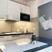Appena varcato l'ingresso una piccola anticamera conduce gli ospiti nella zona living o nella camera da letto. L'arredo del salotto comprende un divano da 3 persone completo di chaise longue, un pouf letto singolo (80 x 195 cm) ed un pratico tavolo da pranzo per 3 persone, posto a ridosso della penisola della cucina a vista. Di fronte alla zona relax è stata approntata una parete attrezzata dove si trova la Smart TV a schermo piatto da 32".