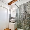 Il bagno è pieno di carattere, grazie ai suoi rivestimenti in cementine, ed è dotato di una grande cabina doccia. Si tratta di un ambiente confortevole ed elegante, dove rilassarsi mentre ci si prende cura di sé.