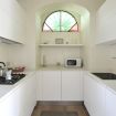 ​Appena dietro alla parte dedicata al relax ed all'intrattenimento, si può accedere alla cucina tramite una porta scorrevole in vetro. Attrezzatissima e realizzata su misura, è caratterizzata dai candidi pensili laccati di bianco opaco, ed è dotata di lavastoviglie, macchina del caffè Nespresso, tostapane, forno elettrico, microonde e fornelli a gas.