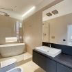 L’appartamento ha due bagni finestrati en-suite, uno dei quali è dotato una spettacolare vasca da bagno, mentre entrambi possono vantare ampie docce realizzate in opera.