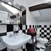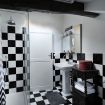 Il bagno è curato in ogni dettaglio, decorato con ceramiche a scacchi bianchi e neri, e dotato di un’ampia e comoda doccia realizzata in opera.